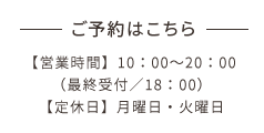 close | 月曜日・火曜日 (休日営業も可能。ご相談ください) |